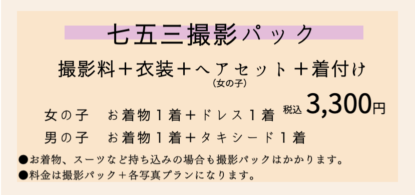七五三撮影プランの場合は下記撮影パックがかかります。